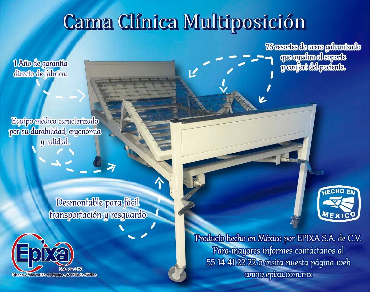 La cama clínica multiposiciones marca DIEX presenta en su diseño y estructura una gama de factores benéficos para el paciente y el médico, con los cuales se puede armonizar una recuperación confortable y de manera eficiente.